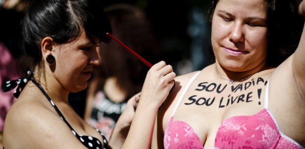 Mulheres pintam o corpo para participar da Marcha das Vadias em São Paulo