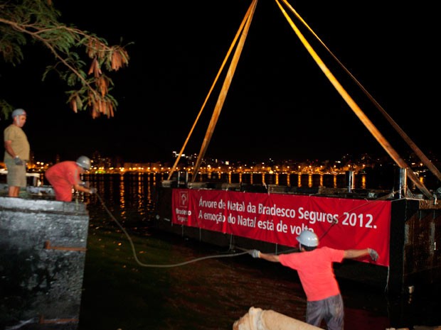 A Árvore de Natal da Bradesco Seguros, a maior árvore de Natal flutuante do mundo - segundo o Guinness Book of Records - começou a ser montada na madrugada deste domingo (16), quando chegaram à Lagoa Rodrigo de Freitas, na Zona Sul do Rio de Janeiro, os 11 flutuadores, que formam a base de 810 metros quadrados para sustentar a árvore, informou o Grupo Bradesco Seguros.