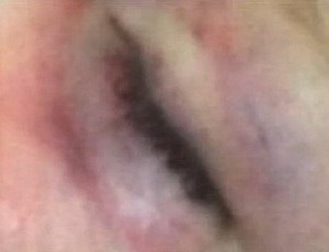casa, encontrou a criança com um olho roxo, lábios inchados e bochechas