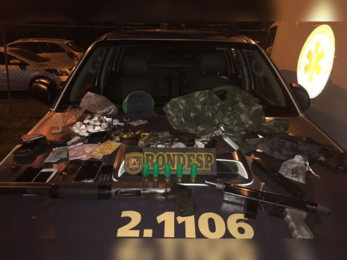 encontrados uma espingarda, uma submetralhadora, um revólver calibre, um