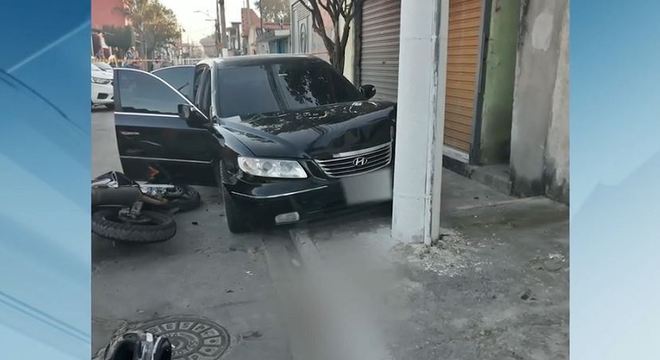 uma moto. O carro bate em um poste e o PM cai da moto com a pancada. Em
